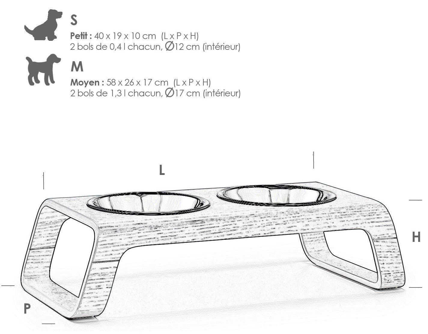 - Taille M : 58 cm x 26 cm x 17 cm, capacité des bols : 1,3L, diamètre intérieur : 17 cm - idéale pour les races telles que Beagle, Collie, Cocker Spagniel, Schnauzer (moyen), Wheaten Terrier, Berger Australien, Pinscher...