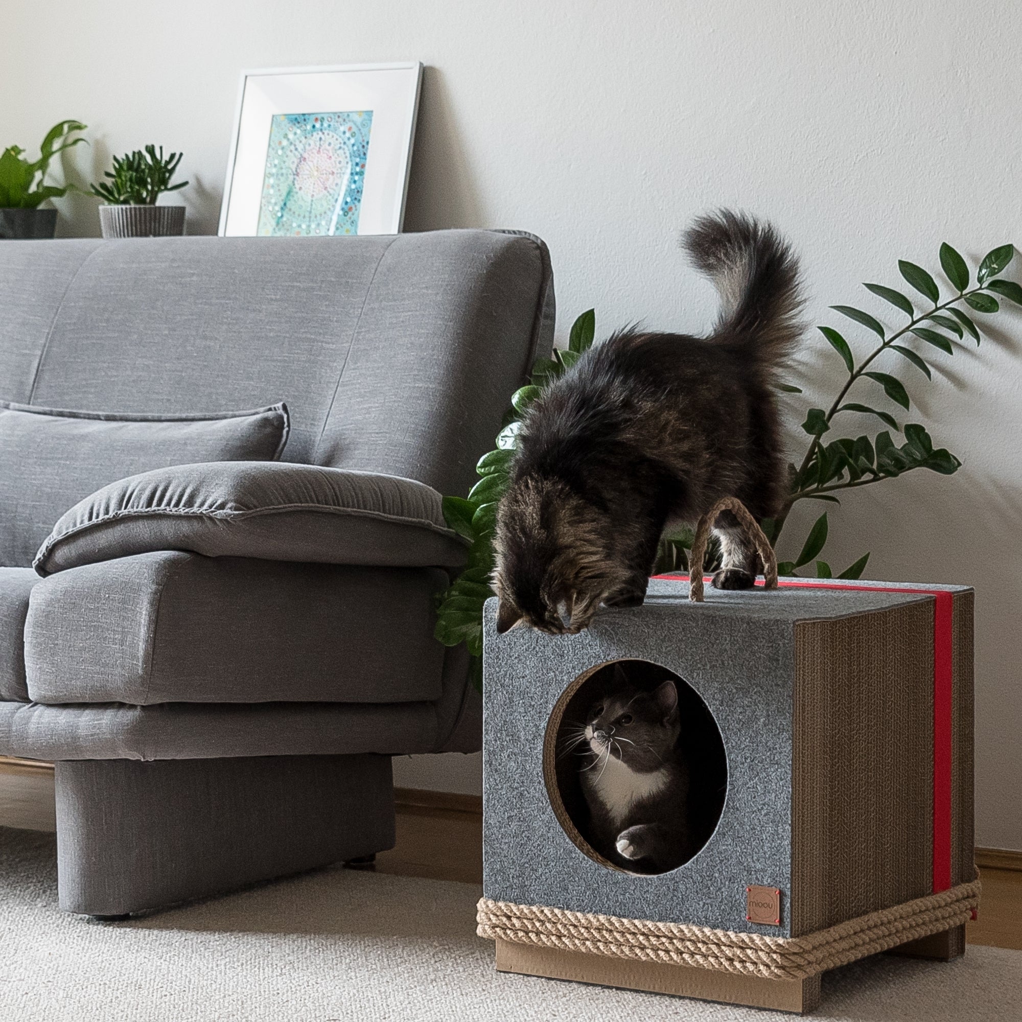 Les éléments de la collection comme les maisons, les tunnels, les griffoirs peuvent être utilisés séparément ou combinés ensembles. Grâce à leur légèreté, leur construction portable et leurs matériaux, les meubles Mioou offrent un maximum de possibilités.