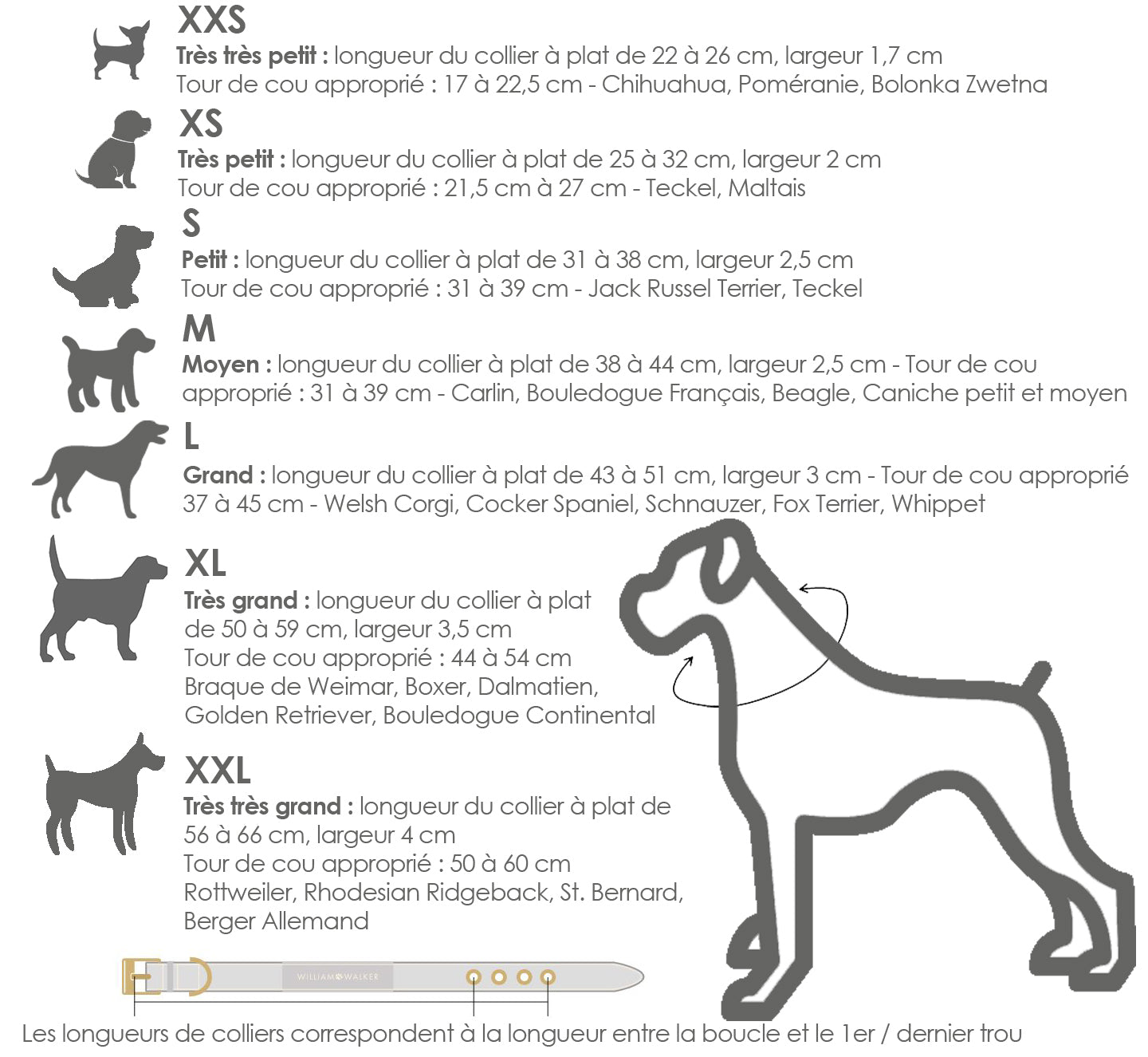 Les tailles indiquées pour cette gamme de colliers ne concernent pas le tour de cou de votre chien ! Il s'agit de la taille du collier posé à plat, de la boucle au premier/plus petit trou et de la boucle au plus grand/dernier trou du collier. C'est donc la longueur du collier et non la circonférence du cou de votre chien qui est surveillé.