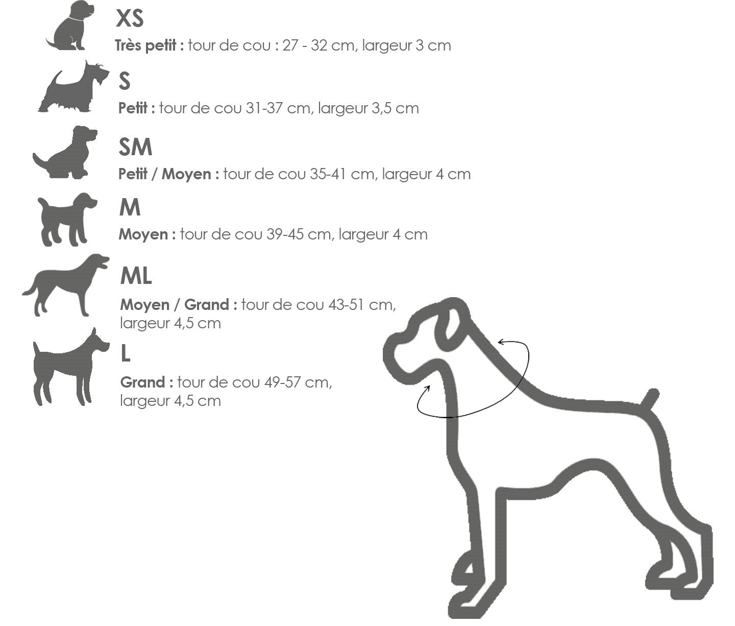 - M/L : Tour de cou 43–51 cm, largeur 4,5 cm : Berger australien, Dalmatien, Weimaraner, Vizsla hongrois, etc.