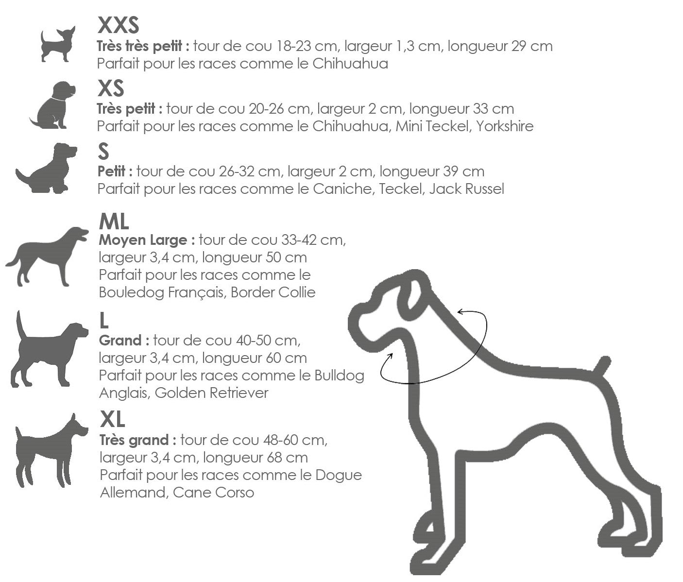 - ML : Longueur : 50 cm - Largeur : 3,4 cm - Tour de cou : 33 - 42 cm - Poids : 94 g - Berger Australien, Border Collie, Bouledogue Français