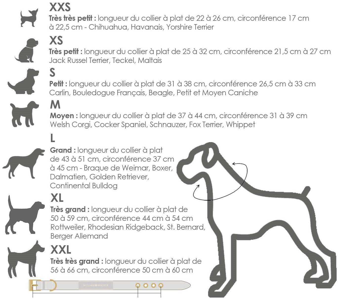 - Pour la taille L, la longueur du collier est de 43 à 51 cm, équivalent à une circonférence d'environ 37 cm à 45 cm. Elle sera généralement adaptée aux races de chiens telles que le Braque de Weimar, Boxer, Dalmatien, Golden Retriever, Bulldog continental...