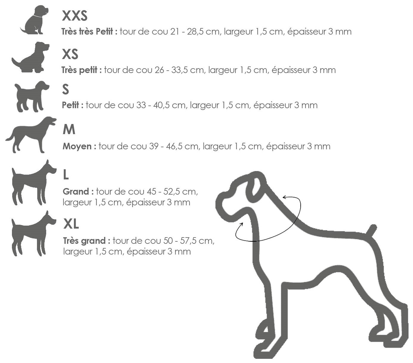 Fir Air se décline en six tailles : Largeur du collier : 1,5 cm, épaisseur : 3 mm, poids : 35 g