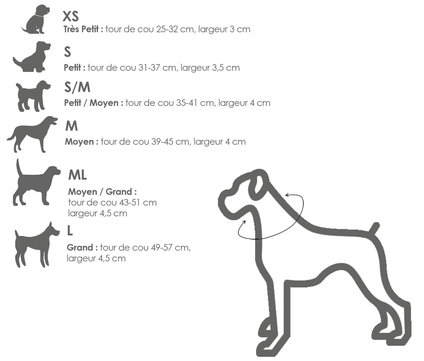 - ML : tour de cou de 43 à 51 cm - largeur 4.5 cm. Prévu pour les races comme le Berger Australien, Dalmatien, Braque de Weimar, Braque Hongrois...