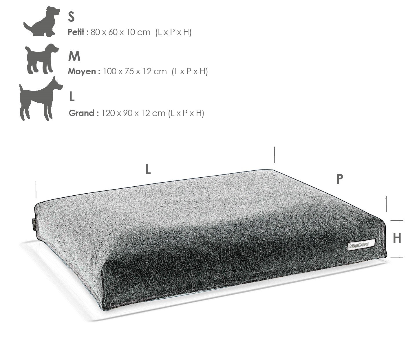 - L : 120 cm x 90 cm x 12 cm: recommandé pour le Bouvier Bernois, Boxer, Golden Retriever, Husky, Labrador, Rhodesian Ridgeback, Setter Irlandais, Dalmatien, Braque de Weimar, Magyar Viszla.