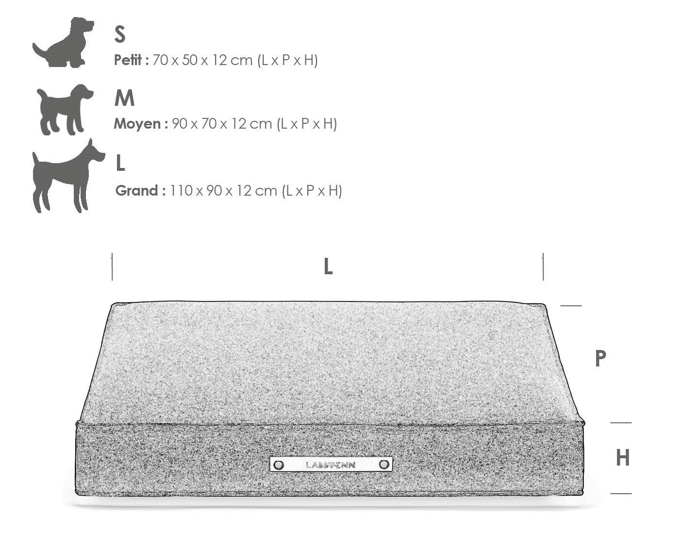 - L : 110 cm x 90 cm x 12 cm : recommandé pour le Bouvier Bernois, Boxer, Golden Retriever, Husky, Labrador, Rhodesian Ridgeback, Setter Irlandais, Dalmatien, Braque de Weimar, Magyar Viszla.