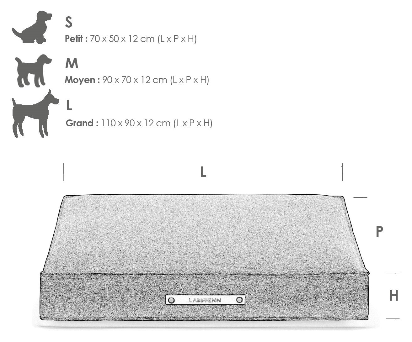 - L : 110 cm x 90 cm x 12 cm : recommandé pour le Bouvier Bernois, Boxer, Golden Retriever, Husky, Labrador, Rhodesian Ridgeback, Setter Irlandais, Dalmatien, Braque de Weimar, Magyar Viszla.