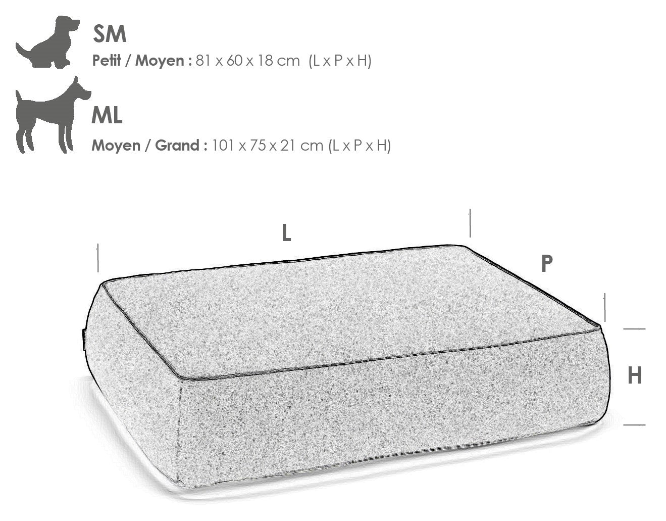 - ML : 101 x 75 x 21 cm (L x L x H), sera plus adaptée pour les races de chiens correspondant par exemple au Bouvier bernois, Boxer, Golden Retriever, Husky, Labrador, Braque hongrois, Rhodesian Ridgeback, Setter irlandais, Dalmatien...