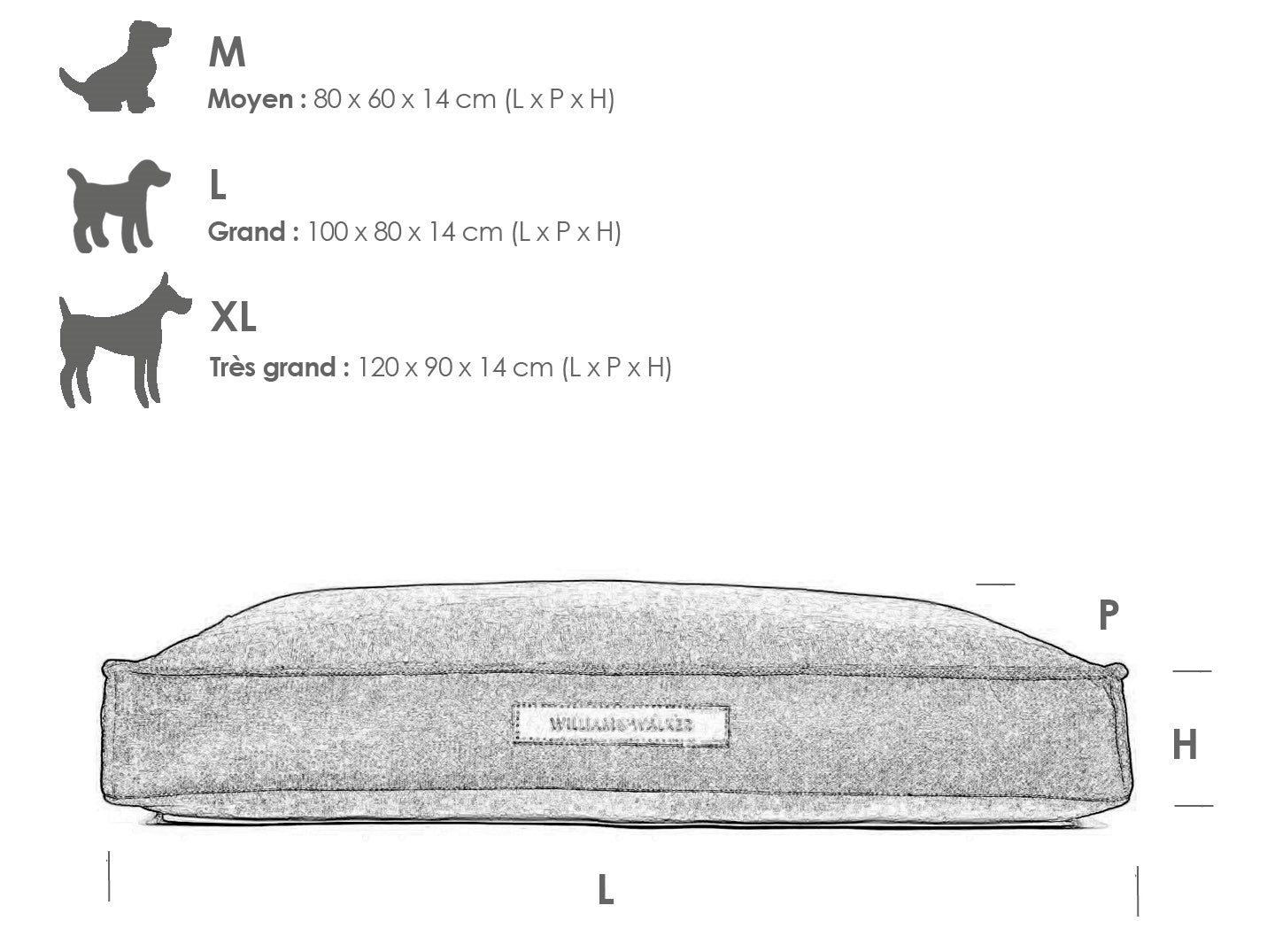 - XL : 120 cm x 90 cm x 14 cm: recommandé pour le Bouvier Bernois, Boxer, Golden Retriever, Husky, Labrador, Rhodesian Ridgeback, Setter Irlandais, Dalmatien, Braque de Weimar, Magyar Viszla.