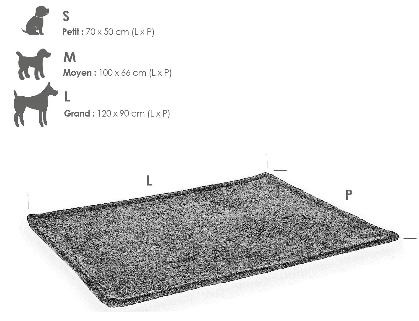 - S : 70 cm x 50 cm x 2 cm. Cette taille est recommandée pour les races telles que Yorkshire Terrier, Jack Russell, Maltais, Teckel, Bouledogue, Caniche Nain, Pékinois, Shih Tzu, Bichon, Corgi.