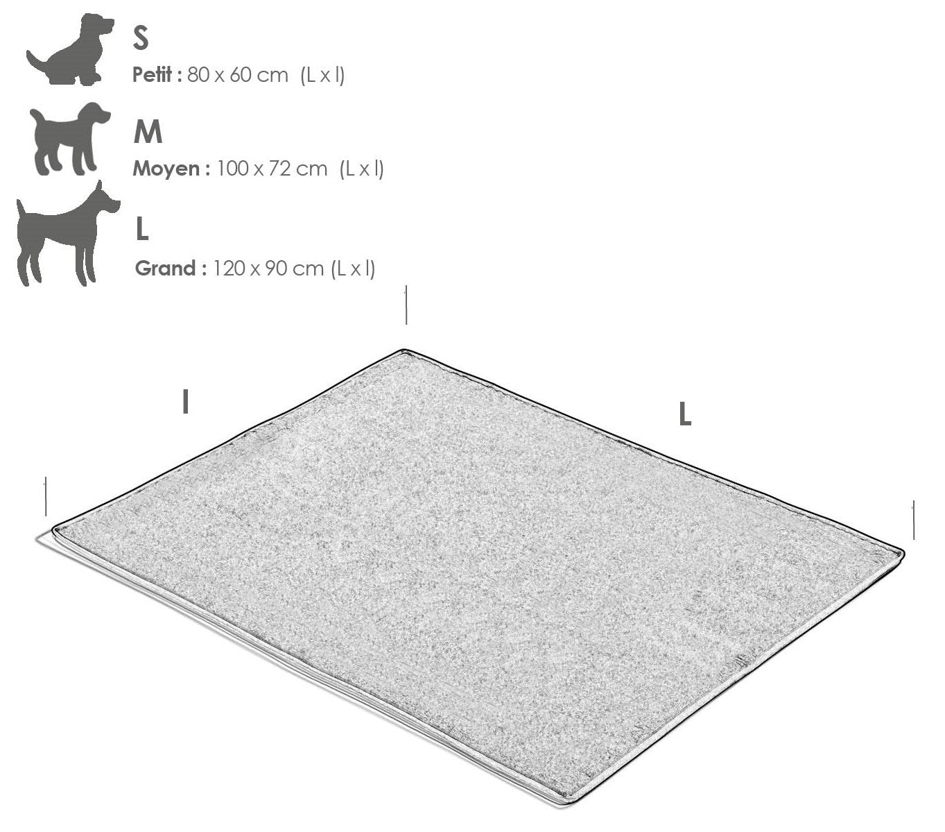 - Petit (S) : 80 cm x 60 cm. Elle est adaptée aux races telles que le Cairn Terrier, Jack Russel, Maltais, Yorkshire, Bouledogue, Teckel, Carlin, Caniche, West Highland Terrier.
