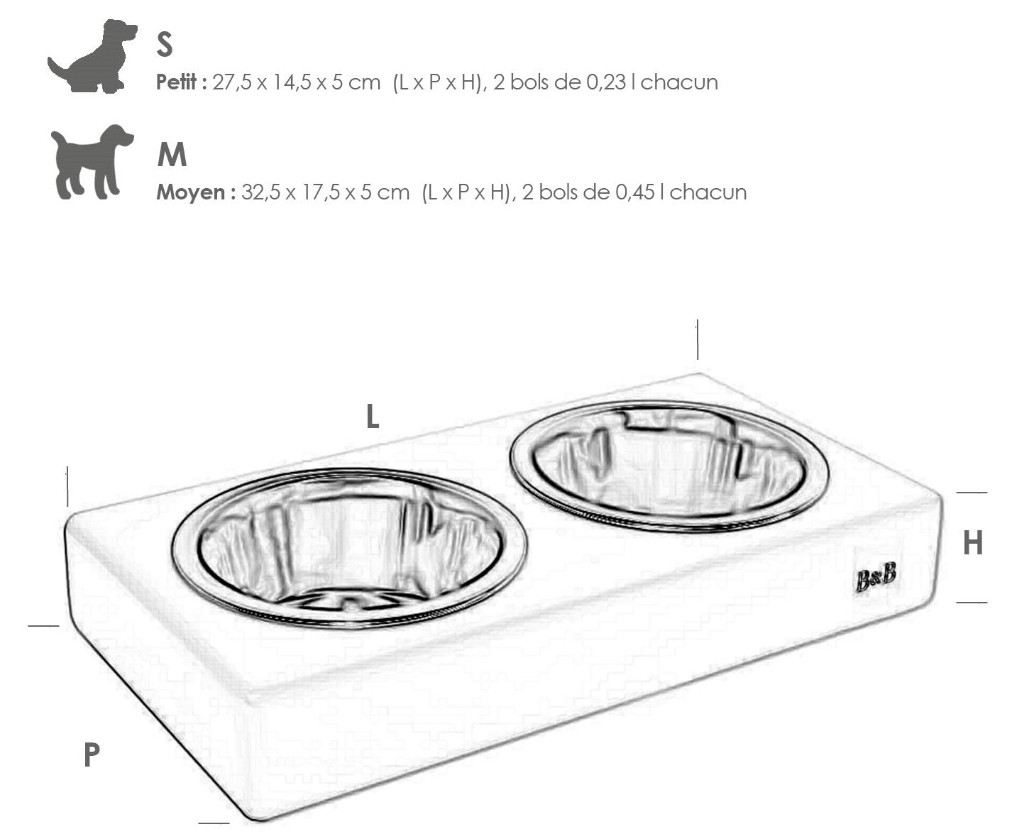 - S : 27,5 cm x 14,5 cm x 5 cm. Capacité des bols d’environ 0,23 litre. Idéale pour les chats ou les petits chiens comme les Chihuahua, Russian Toy Terrier, Mini Yorkshire Terrier.