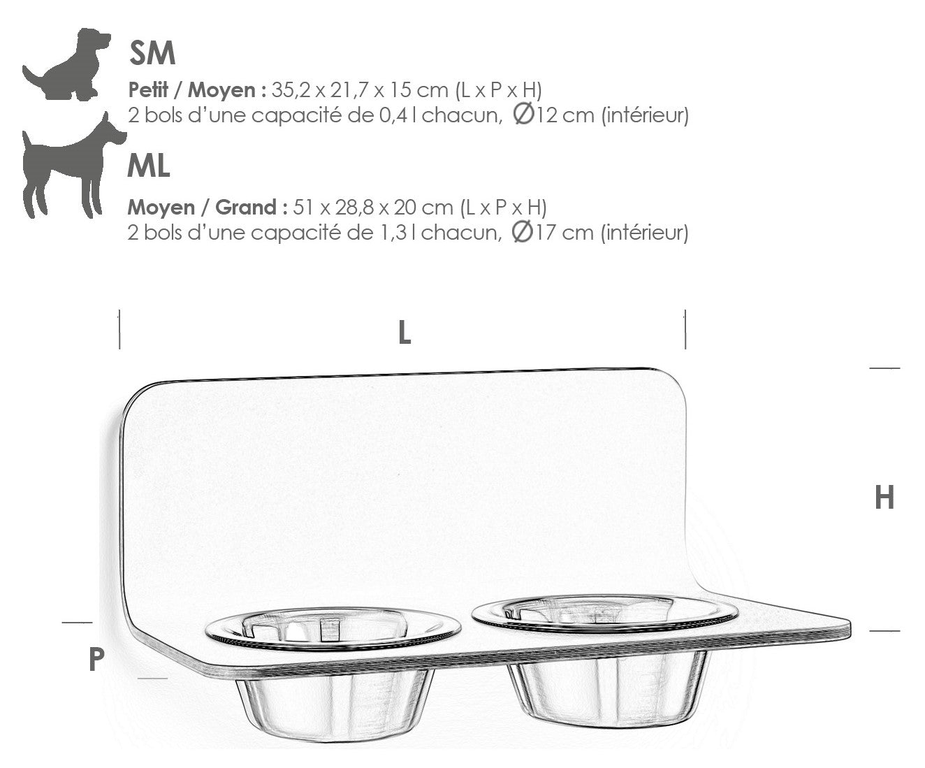 - La taille SM est recommandée pour les races de type Bouledogue, Teckel, Carlin, Caniche, West Highland Terrier, Pinscher... Le diamètre intérieur du bol est de 12 cm pour une capacité de 0,4 L.