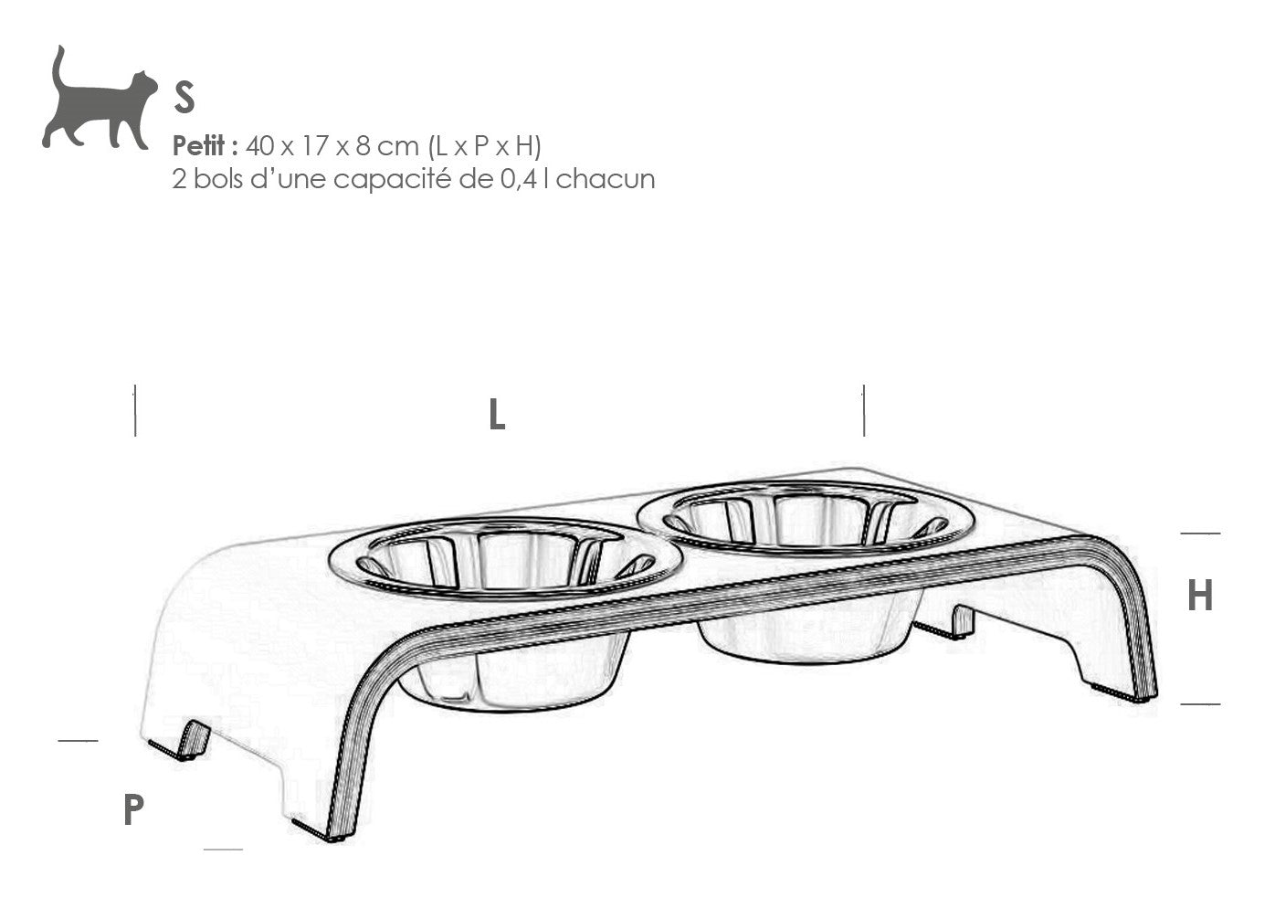 De dimension unique (40 cm x 17 cm x 8 cm - Longueur x Largeur x Hauteur), cette gamelle pour chat très élégante propose deux bols de 0,4 L pour la version en acier inoxydable et 0,3 L pour les bols en porcelaine. Le poids de cette gamelle est d'environ 1,5 kg.