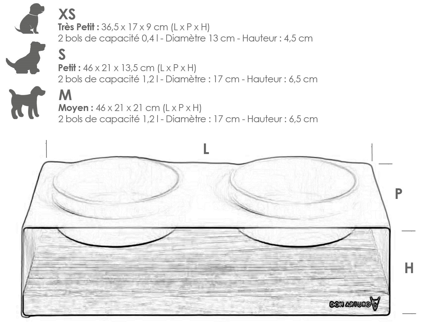 - XS : structure 36,50 cm x 17 cm x 9 cm - Bols : Ø 13 cm, hauteur 4,5 cm - capacité de 0,4 litre
