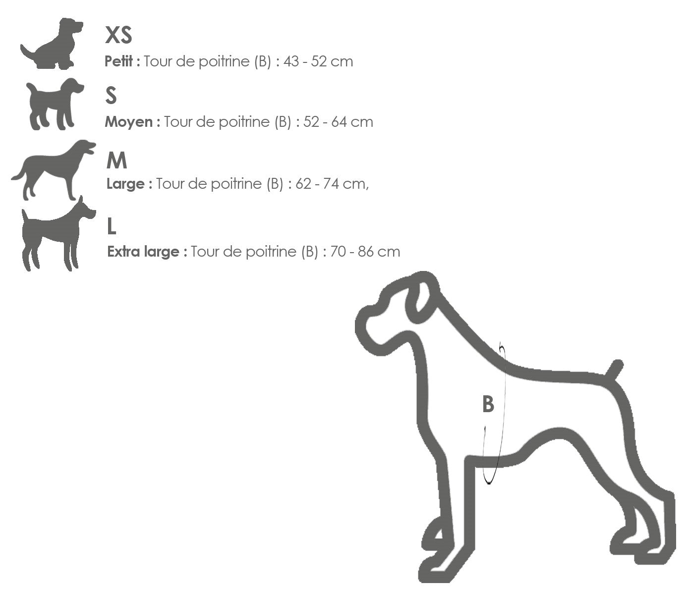 - Taille L : prévu pour les poitrines de 70 à 86 cm, il conviendra aux races comme le Berger australien, Dalmatien, Braque de Weimar, Braque hongrois...