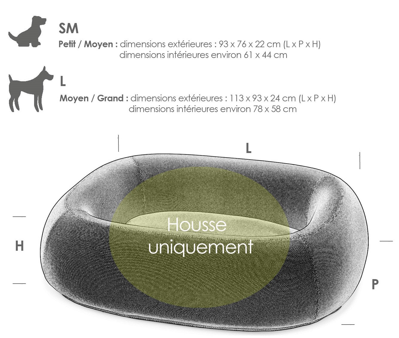 - M / L : 113 cm x 93 cm x 24 cm (extérieur) et 78 cm x 58 cm (intérieur), adapté aux Bouvier bernois, Boxer, Dalmatien, Golden Retriever, Labrador, Rhodesian Ridgeback, Setter irlandais, Braque de Weimar, Braque hongrois.