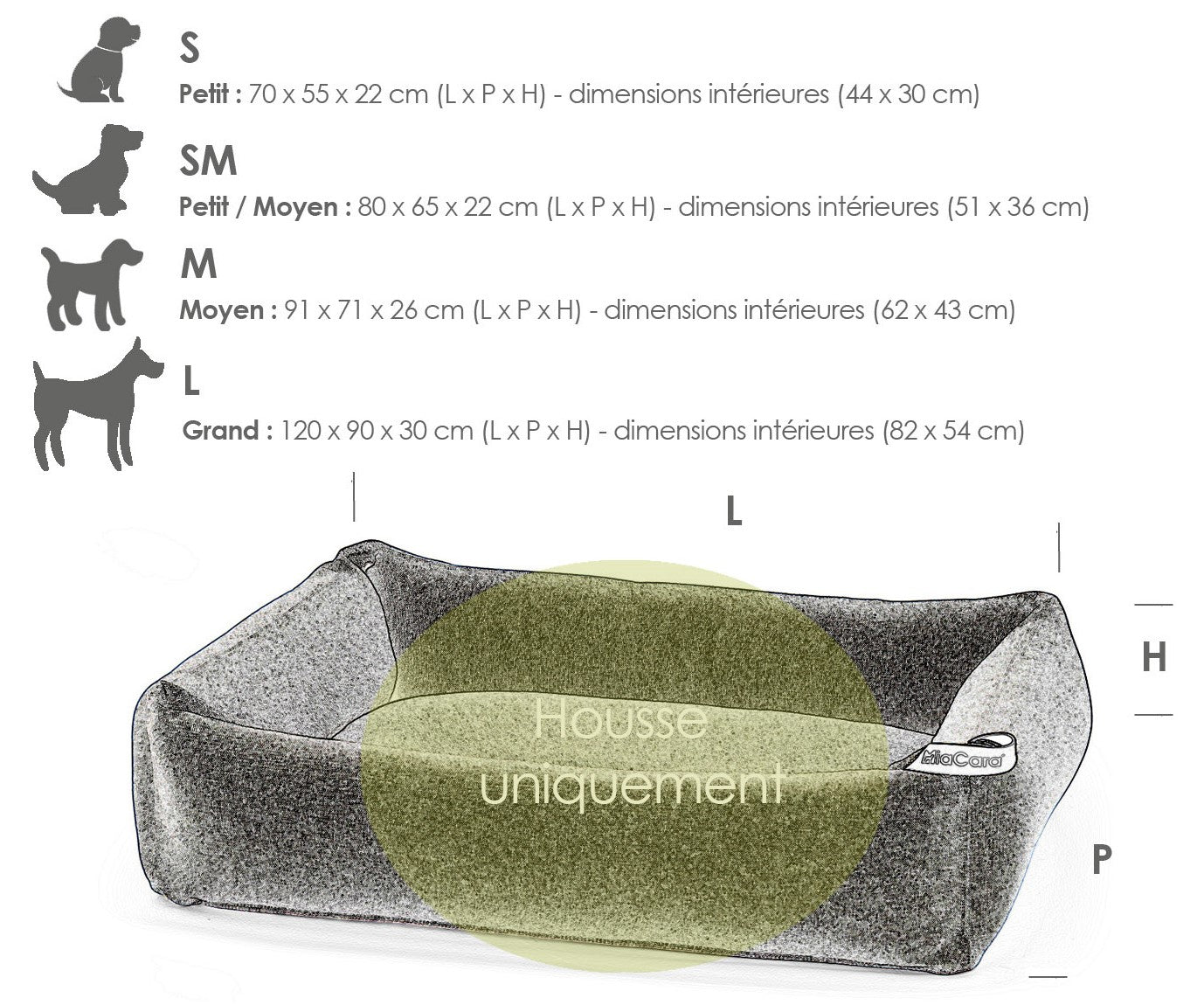 - la taille S/M : extérieur : 80 cm x 65 cm x 24 cm, intérieur : 51 cm x 36 cm. Elle sera adaptée aux races comme le Bouledogue, Teckel, Carlin, Caniche, West Highland Terrier, Pinscher...