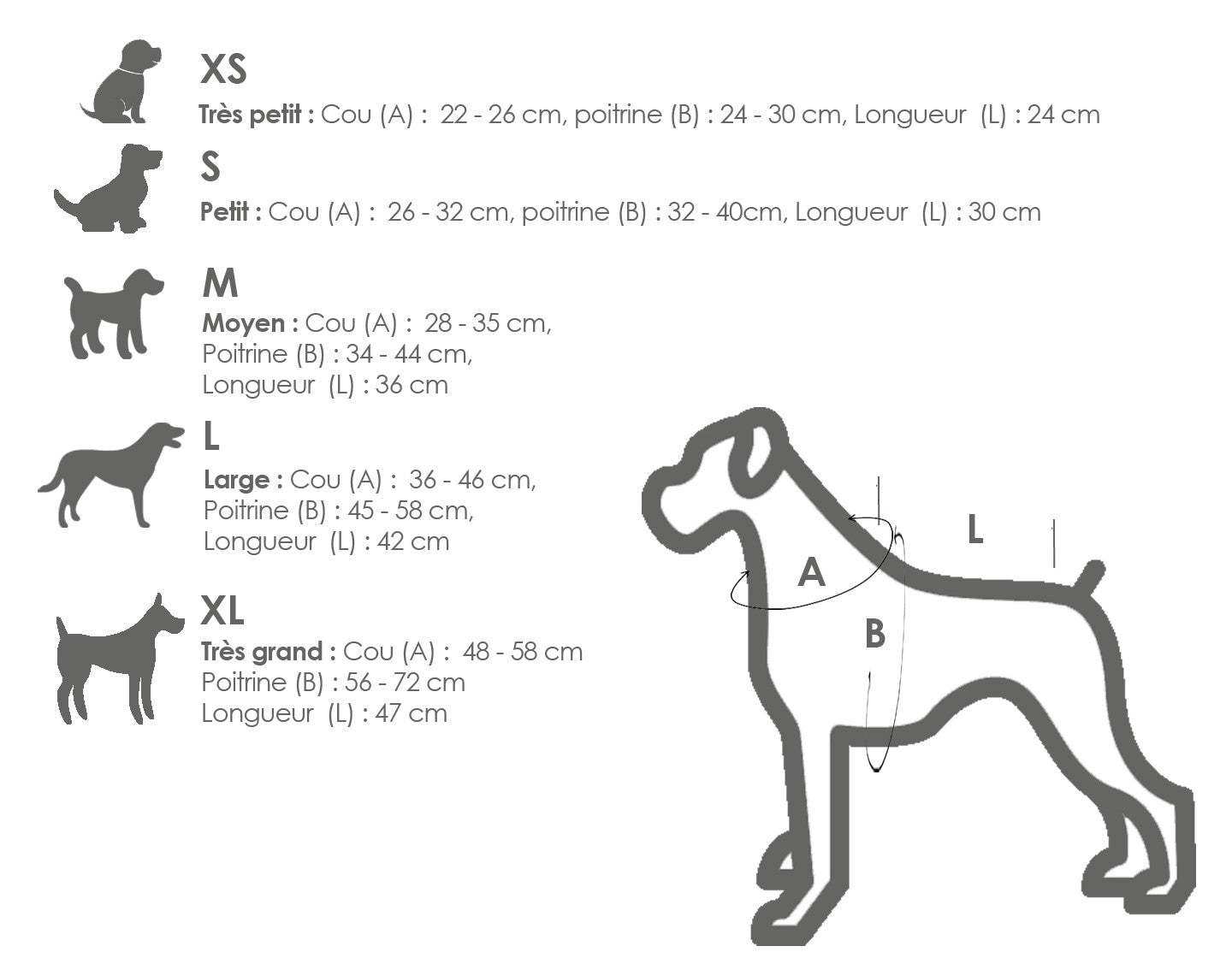 - XL : prévu pour le Bobtail, Bull Terrier Labrador. Tour de cou : 48 à 58 cm. Tour de poitrine : 56 à 72 cm. Longueur : 47 cm.