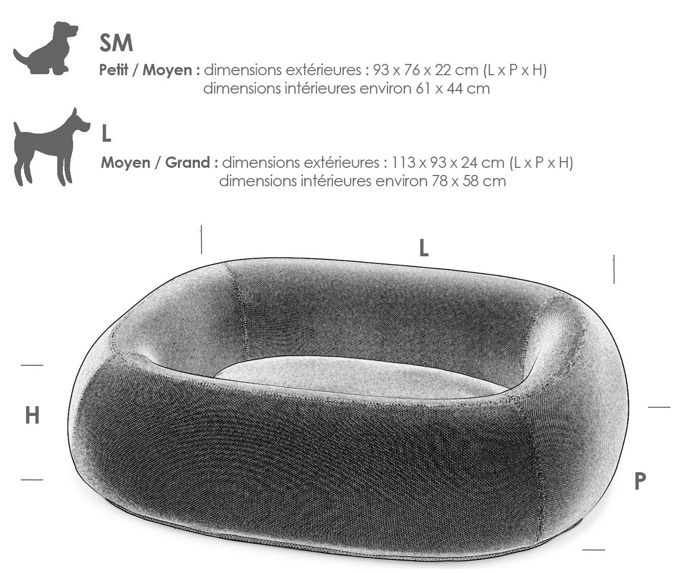 - M / L : 113 cm x 93 cm x 24 cm (extérieur) et 78 cm x 58 cm (intérieur), adapté aux Bouvier bernois, Boxer, Dalmatien, Golden Retriever, Labrador, Rhodesian Ridgeback, Setter irlandais, Braque de Weimar, Braque hongrois.