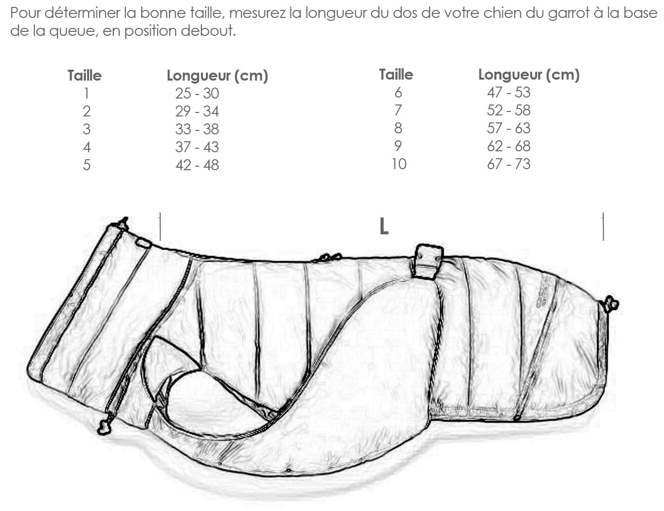 Cosima est disponible en 10 tailles. Pour déterminer la bonne taille, mesurez la longueur du dos de votre chien depuis le garrot, le point le plus élevé entre les omoplates, jusqu'à la base de la queue lorsque le chien est en position debout. Assurez-vous de bien mesurer, car les dimensions peuvent varier de quelques centimètres selon la façon dont le chien est gardé. Remarque : le manteau d'hiver est plus petit. Si vous êtes entre deux tailles, choisissez la taille la plus grande.