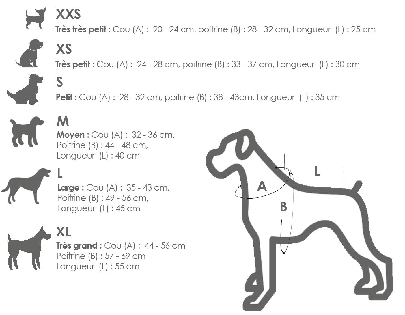 Ce manteau est proposé en six tailles. Pour choisir la bonne taille, mesurez la circonférence du cou et de la poitrine de votre chien, ainsi que la longueur du tronc et accordez un peu de réserve.