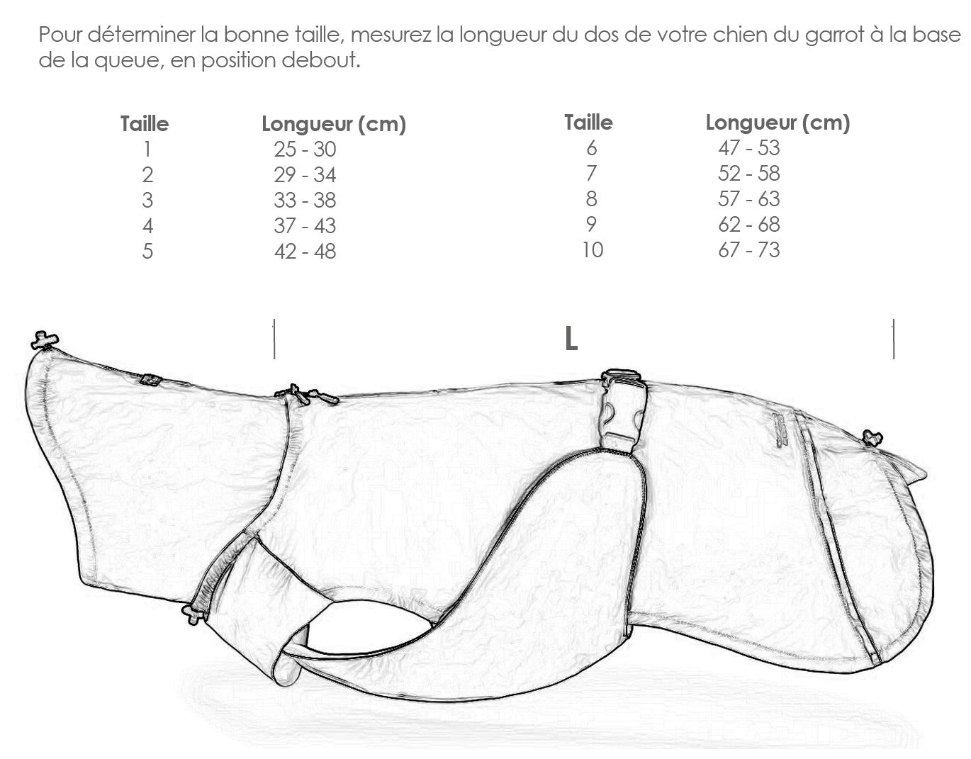 Pour déterminer la bonne taille, mesurez la longueur du dos de votre chien, de son garrot (entre les omoplates) jusqu'à la base de sa queue en position debout. Si vos mesures sont entre deux tailles, prenez la plus petite car ce manteau taille grand.