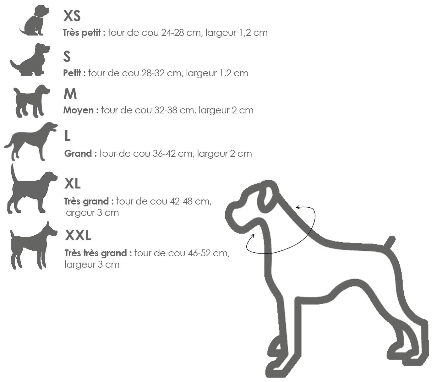 - Pour la taille S, prévue pour un tour de cou de 28 cm à 32 cm, largeur de 1,2 cm. Cette taille est prévue pour les races telles que le Carlin, Bouledogue français, Beagle, petit et moyen Caniche...