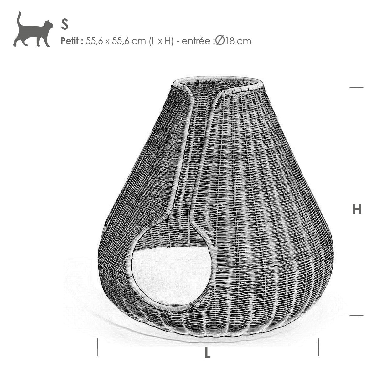 La forme originale de ce panier pour chat en fera à la fois un objet décoratif et l'accessoire préféré de votre chat. Sa forme très spécifique en goutte permet à votre chat de se cacher. Elle lui permet aussi de garder un œil sur son environnement grâce à sa finition légèrement ajourée. Cette niche fabriquée à la main donne à votre chat un sentiment de sécurité pour une sieste ultra relaxante dans ce refuge spécialement conçu pour se mettre au calme.