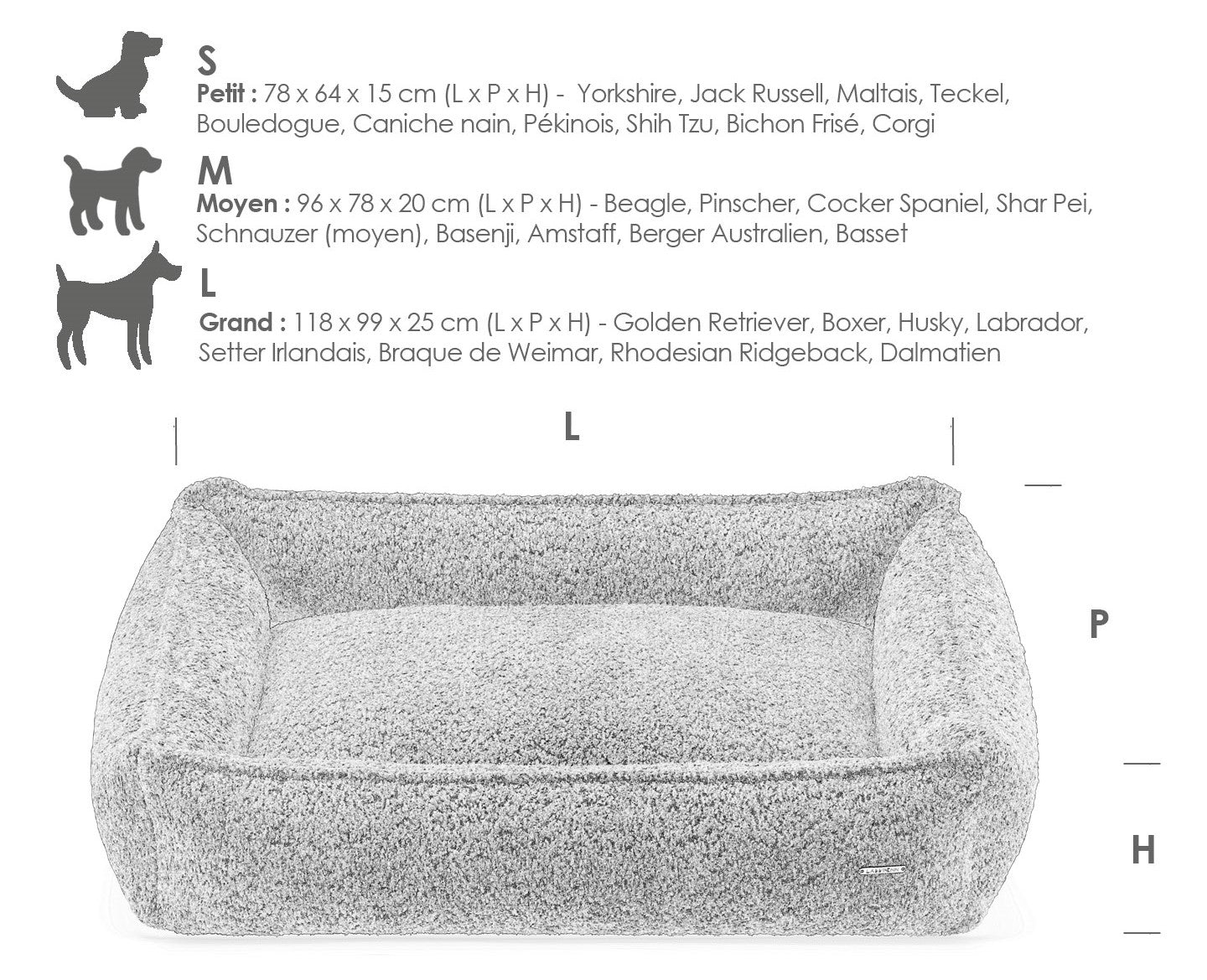 - S : 78 cm x 64 cm x 15 cm (dimensions extérieures), 55 cm x 40 cm x 15 cm (dimensions intérieures). Cette taille est recommandée pour les races telles que Yorkshire Terrier, Jack Russell, Maltais, Teckel, Bouledogue, Caniche Nain, Pékinois, Shih Tzu, Bichon, Corgi.