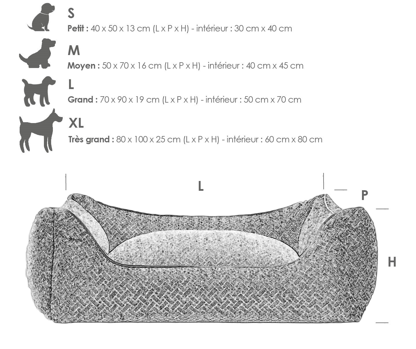 - la taille XL : extérieur : 80 cm x 100 cm x 25 cm, intérieur : 60 cm x 80 cm. Elle sera quant à elle adaptée aux grands chiens comme le Bouvier Bernois, Boxer, Golden Retriever, Husky, Labrador, Rhodesian Ridgeback, Braque de Weimar, Braque Hongrois...