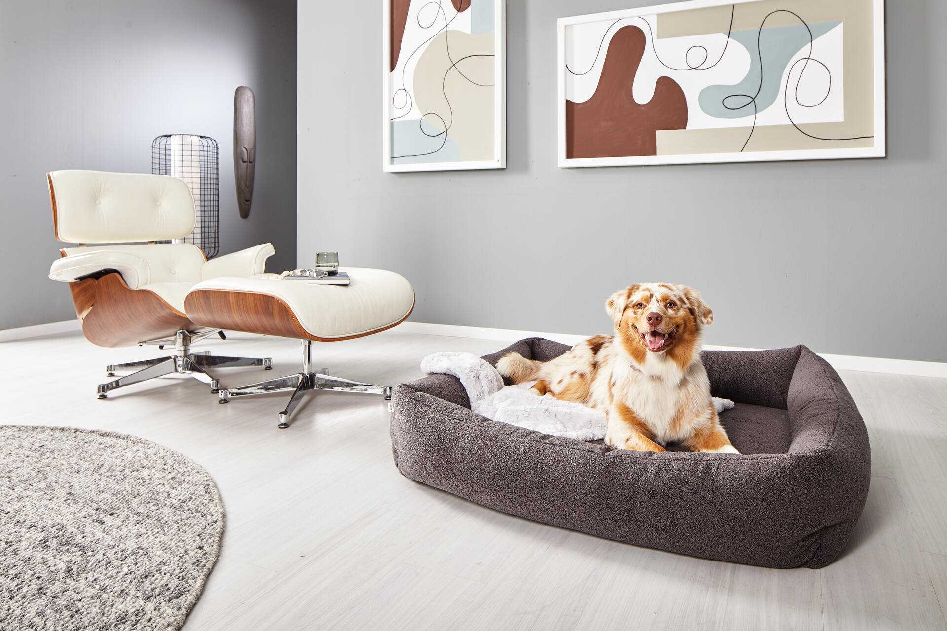 La forme rectangulaire du panier s'adapte à toutes les pièces et à tous les intérieurs et sa hauteur (entre 20 et 25 cm en fonction de la taille du lit choisie) isole parfaitement votre chien du sol.