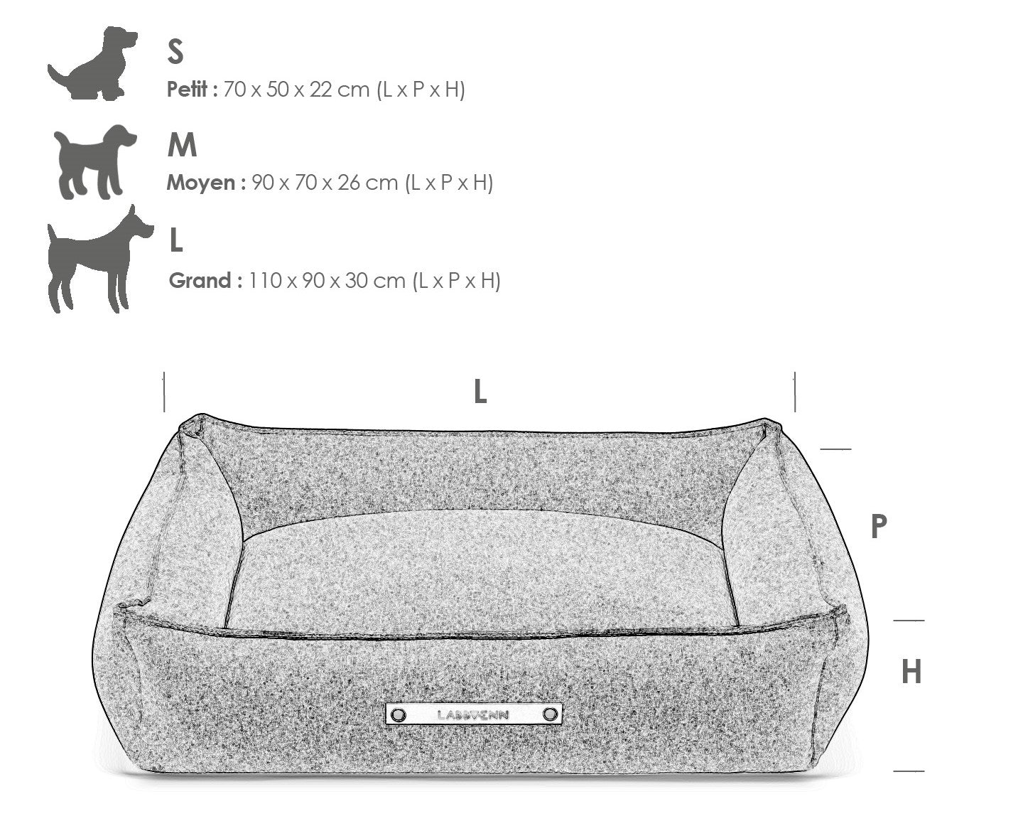 - S : 78 cm x 64 cm x 15 cm (dimensions extérieures), 55 cm x 40 cm x 15 cm (dimensions intérieures). Cette taille est recommandée pour les races telles que Yorkshire Terrier, Jack Russell, Maltais, Teckel, Bouledogue, Caniche Nain, Pékinois, Shih Tzu, Bichon, Corgi.