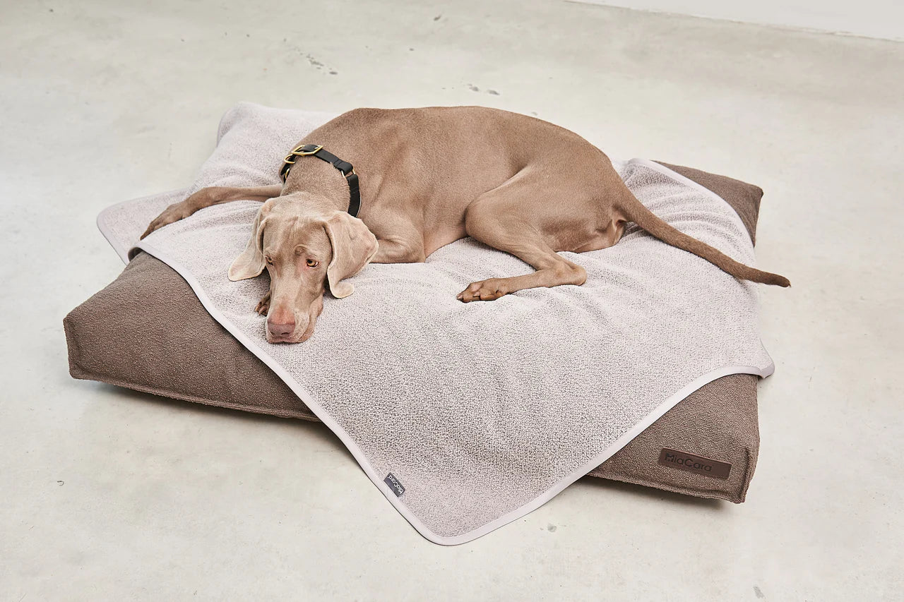 La couverture peut être lavée en machine à 30°C en cycle délicat ou nettoyée à sec délicatement. Après le lavage, laissez-la sécher sur un étendoir. Si nécessaire, elle peut être repassée à basse température. Pour un entretien rapide et facile, les poils de chien peuvent être secoués ou retirés à l'aide de la brosse à meubles de votre aspirateur. Pour éliminer les taches, appuyez doucement un chiffon humide sur la zone concernée et nettoyez en mouvements circulaires. Répétez l'opération si nécessaire. Pour les taches plus tenaces, un nettoyant doux est recommandé. Évitez d’utiliser des solvants, des nettoyants abrasifs agressifs ou tout produit contenant du DMF (diméthylformamide), des cétones, des esters, du méthylbenzène ou du toluène.