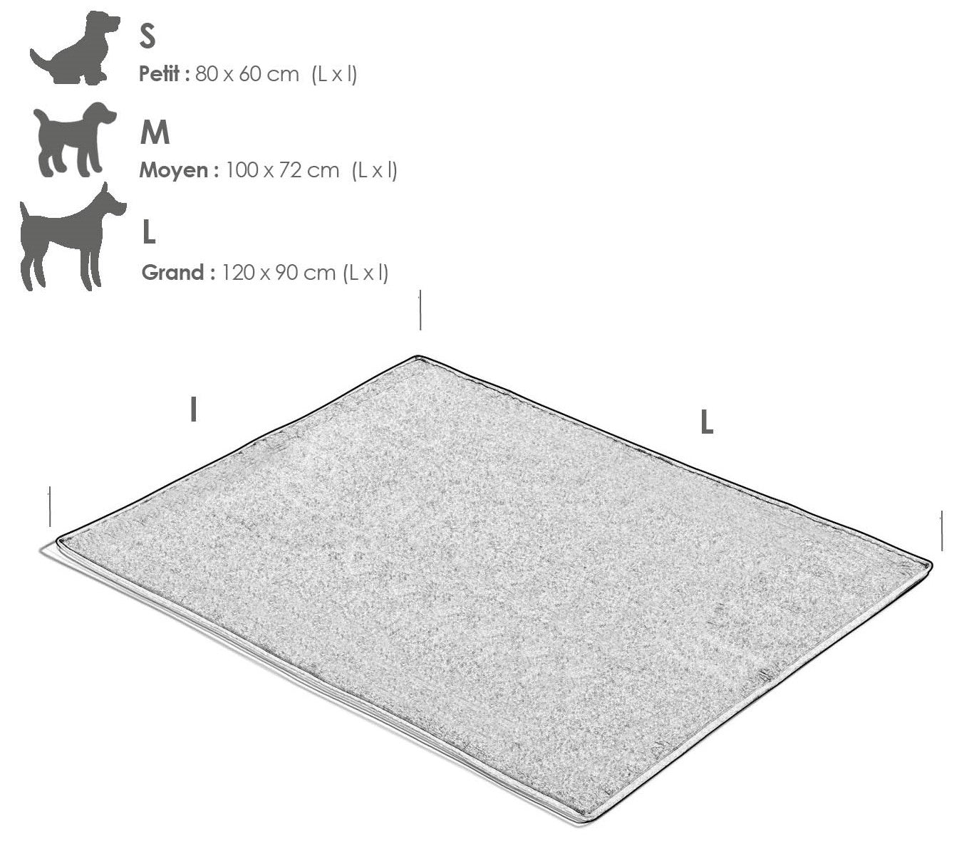 - L : 120 cm x 90 cm. Recommandé pour les grands chiens comme le Bouvier Bernois, le Boxer, le Golden Retriever, le Husky, le Labrador, Setter Irlandais, Braque de Weimar, Magyar Vizsla.