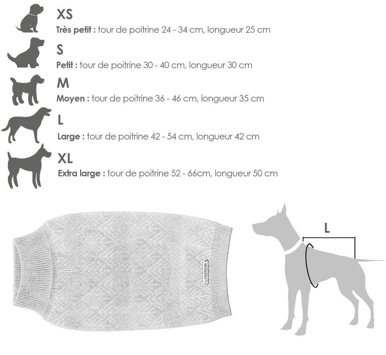 - XL : prévu pour le Bobtail, Bull Terrier Labrador. Tour de poitrine : 52 à 66 cm. Longueur : 50 cm.