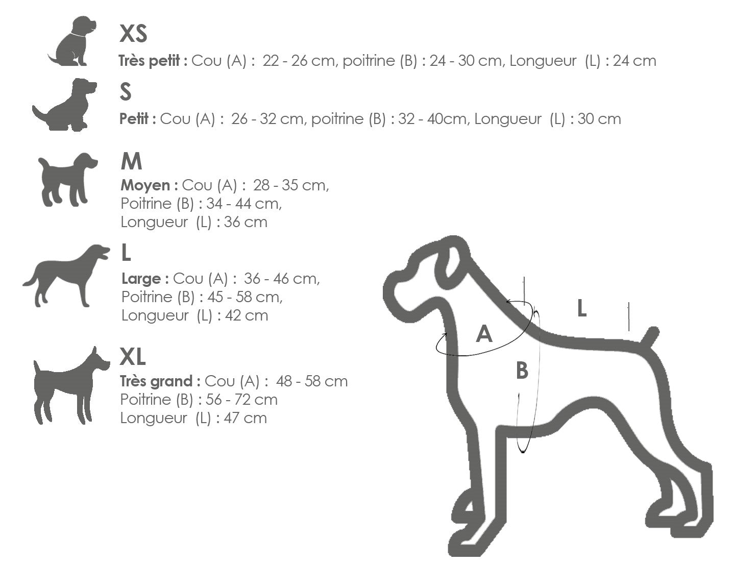 - XL : prévu pour le Bobtail, Bull Terrier Labrador. Tour de cou : 48 à 58 cm. Tour de poitrine : 56 à 72 cm. Longueur : 47 cm.
