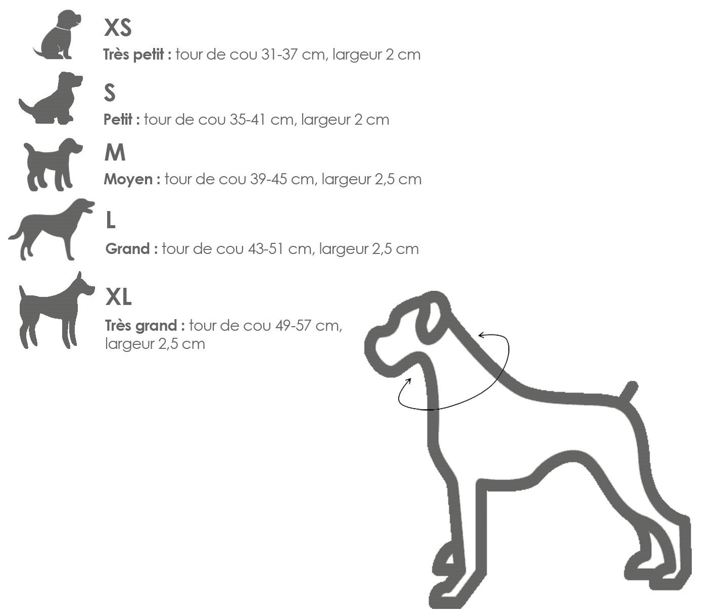- XL : recommandée pour les races comme le Bouvier bernois, Boxer, Golden Retriever, Husky, Labrador, Rhodesian Ridgeback...