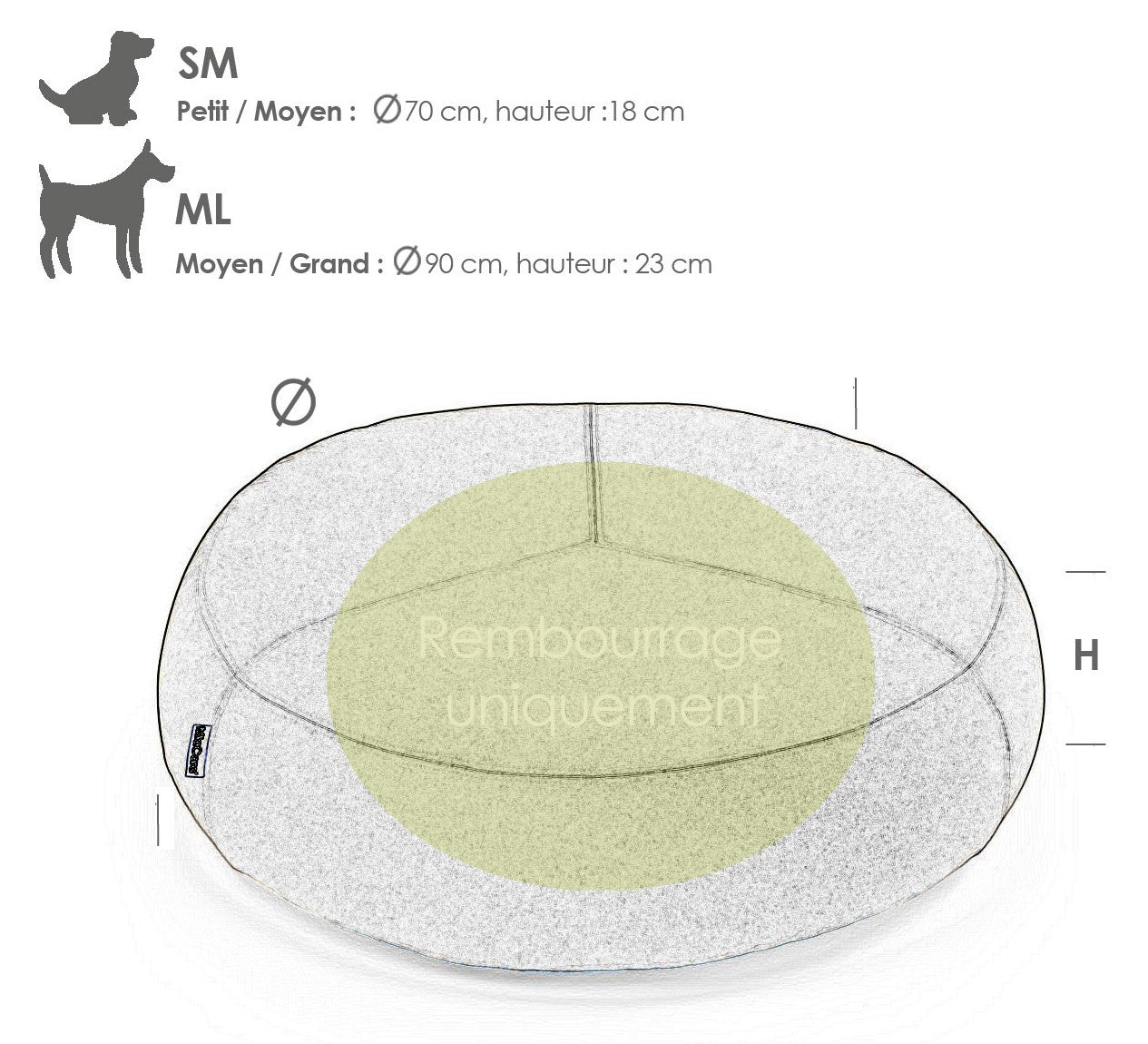 - ML : diamètre de 90 cm - hauteur 23 cm. Idéal pour les races de chiens de grande taille comme le Bouvier Bernois, Boxer, Golden Retriever, Husky, Labrador, Rhodesian Ridgeback, Setter Irlandais, Dalmatien, Braque de Weimar, Magyar Vizsla.