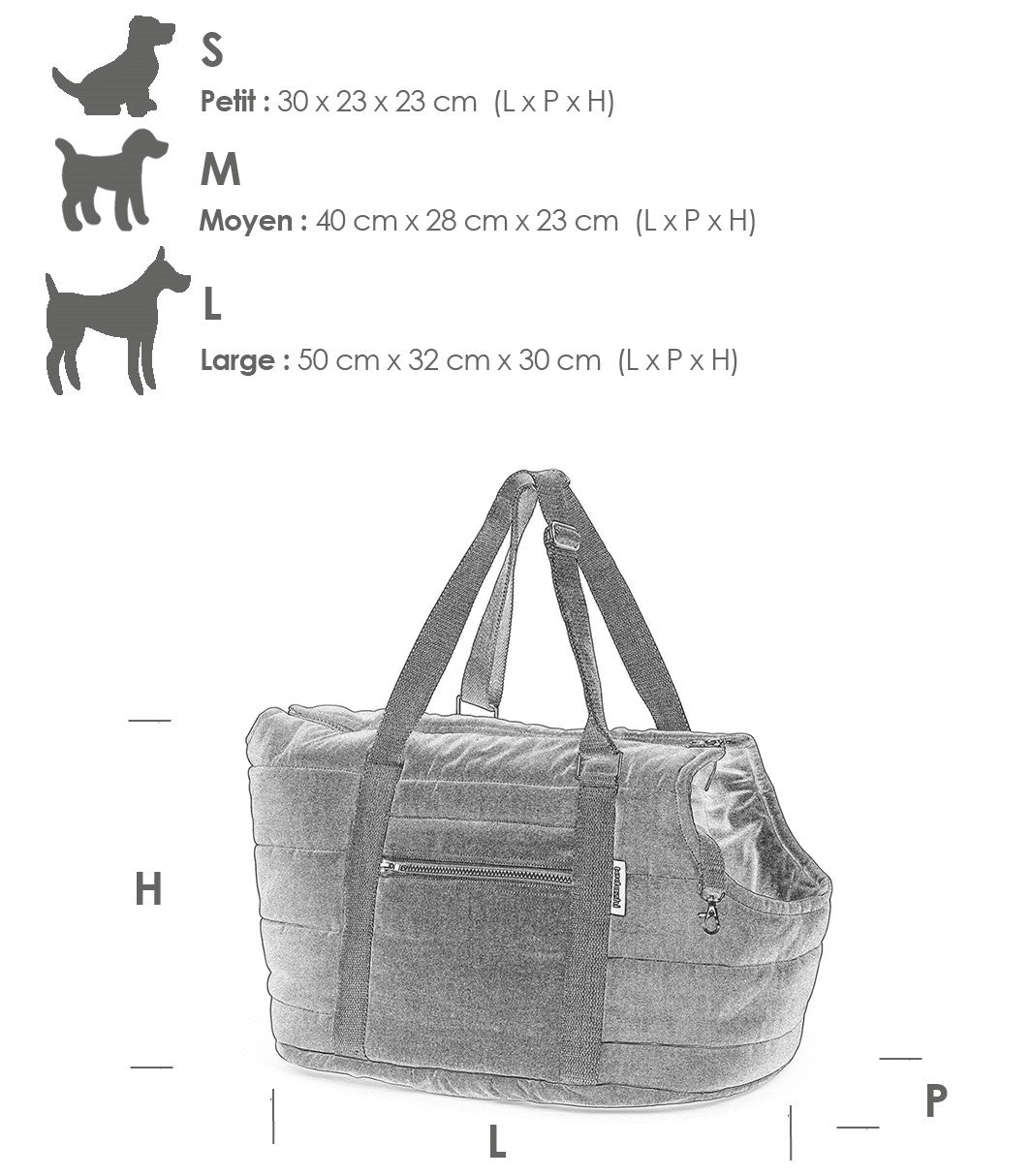 - L : 50 cm x 32 cm x 30 cm. (longueur x largeur x hauteur) ; il convient à des chiens de petite et moyenne taille de moins de 15 kg.