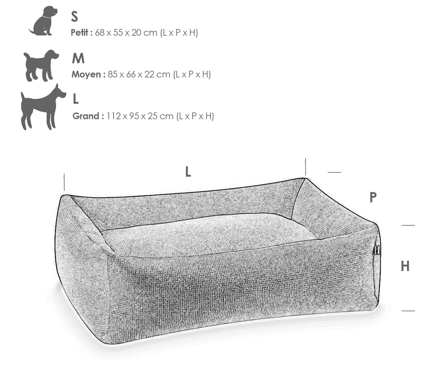 - L : 112 cm x 95 cm x 25 cm (dimensions extérieures), 82 cm x 63 cm (dimensions intérieures). Parfait pour le Golden Retriever, Boxer, Husky, Labrador, Dalmatien, Setter Irlandais, Braque de Weimar, Rhodesian Ridgeback