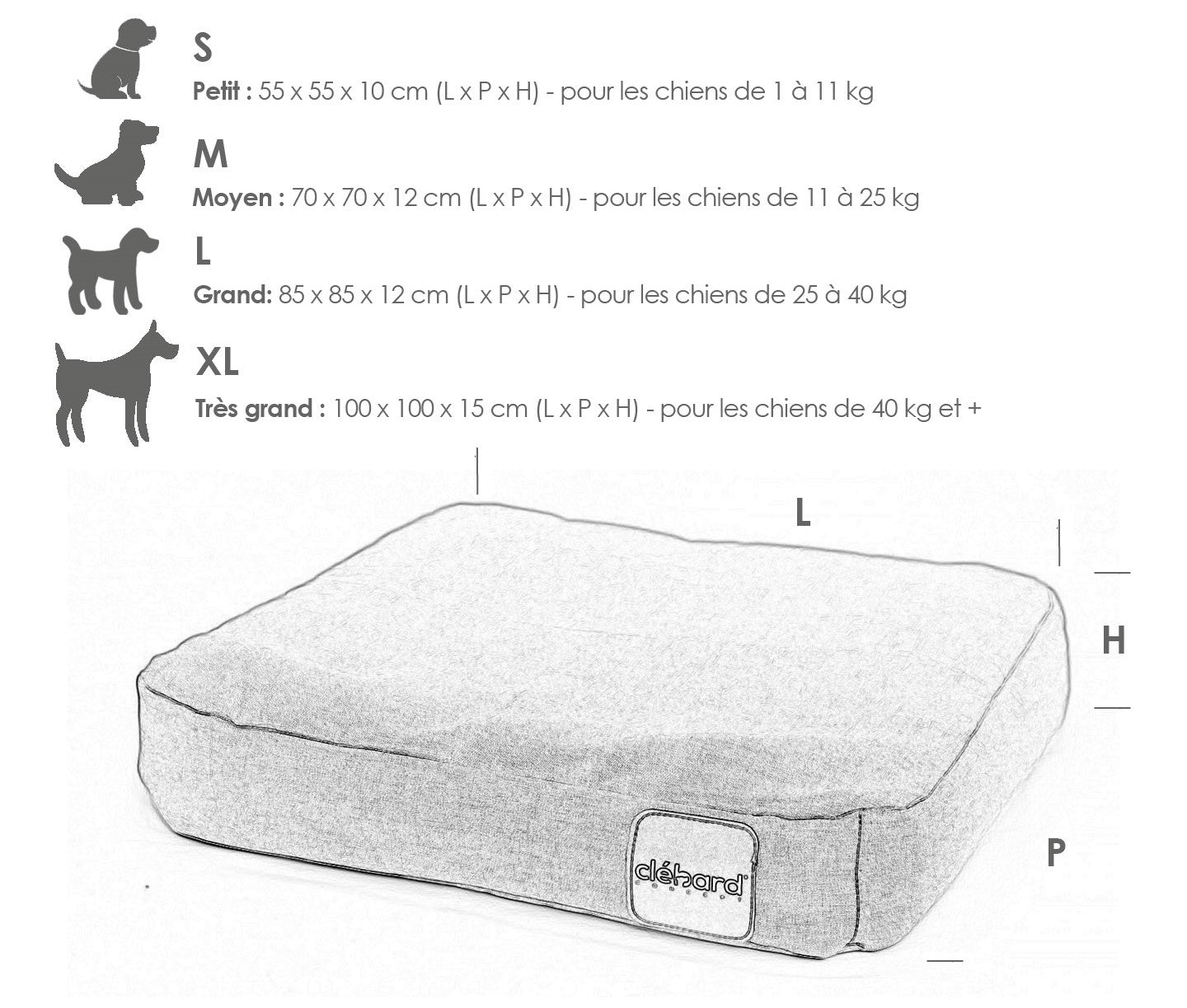 - S : 55 cm x 55 cm x 10 cm (poids du chien : 1 à 11 kg). Elle accueillera les petites races comme le Jack Russel, Maltais, Pékinois, Yorkshire Terrier, Teckel Toy...